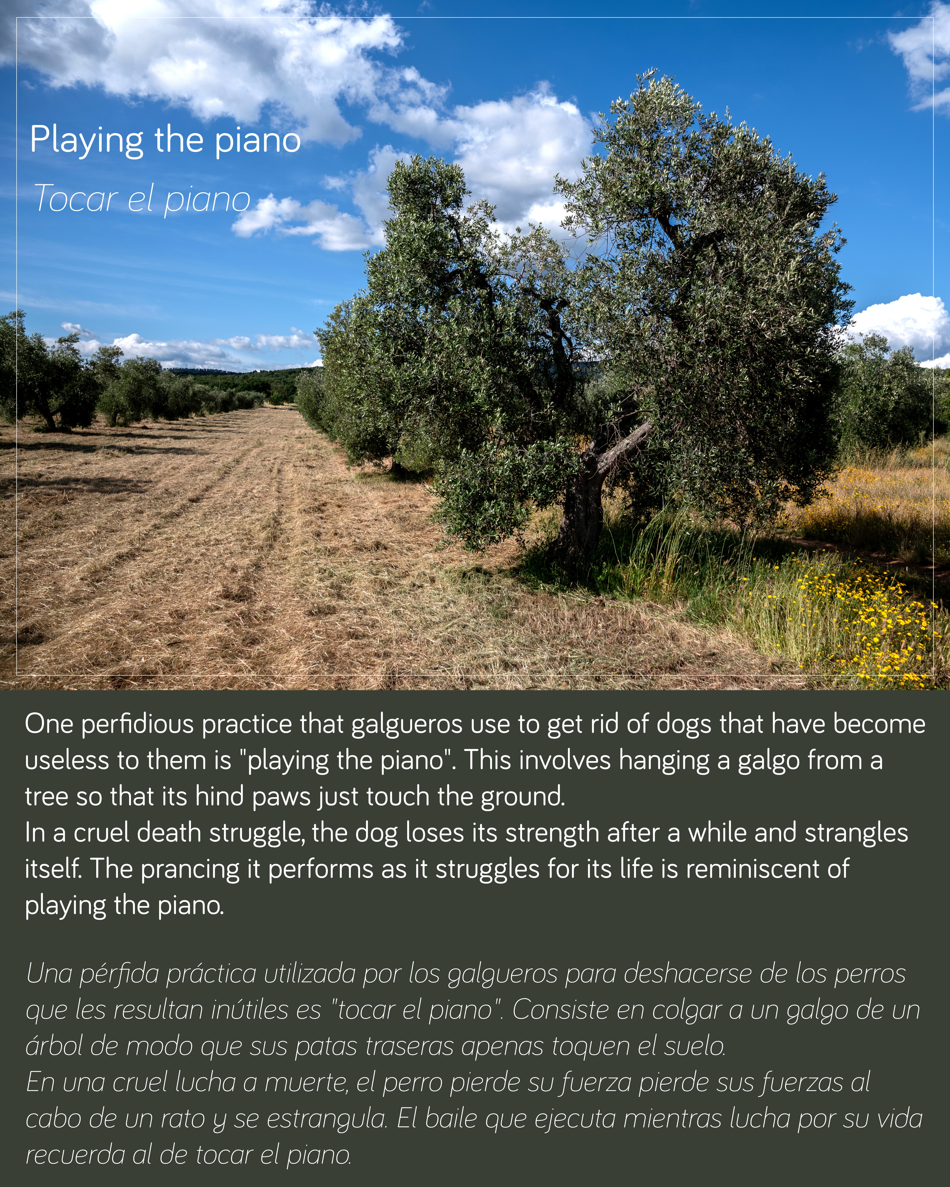 Eine perfide Praxis, die Galgueros anwenden, um Hunde loszuwerden, die für sie nutzlos geworden sind, ist das "Klavierspielen". Dabei wird ein Galgo so an einem Baum aufgehängt, dass seine Hinterpfoten gerade noch den Boden berühren. In einem grausamen Todeskampf verliert der Hund nach einer Weile seine Kraft und stranguliert sich selbst.